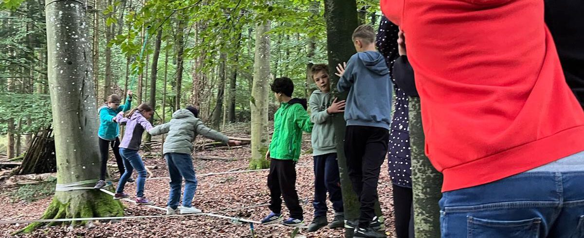 Schon am Morgen machten sich die Klassen auf den Weg zum nahegelegenen Waldgebiet. Nach einer kurzen stärkenden Vesperpause ging es an die erste Aufgabe. Es galt die „Hühnerleiter“ zu überwinden. Eine Aufgabe, bei der die Schüler und Schülerinnen über Stäbe, die die anderen halten zu steigen. Frische Luft, buntes Herbstlaub und das Rascheln der Blätter unter den Schuhen – besser hätte der Einstieg nicht sein können!