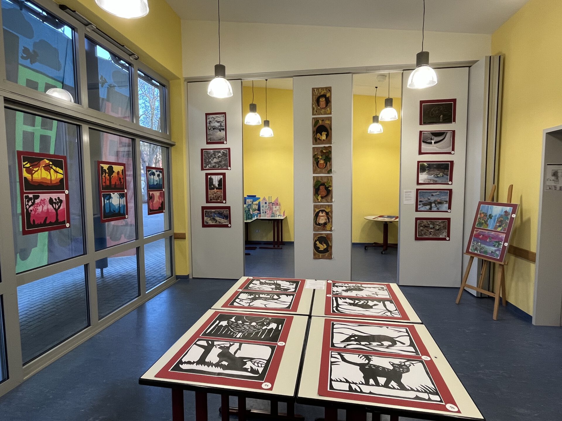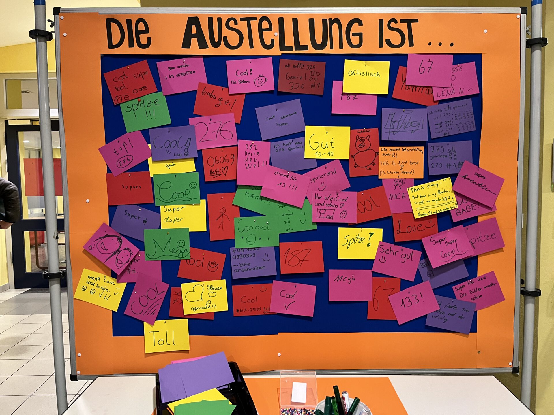 Die Ausstellung war hervorragend besucht: Viele Besucherinnen und Besucher zeigten sich begeistert von der hohen Qualität der Werke und nutzten die Gelegenheit zum Gespräch mit den Schülerinnen und Schülern. Neben den Kunstwerken sorgten ein Mitmachprogramm und die Bewirtung durch die Klasse H7 für eine lebendige Atmosphäre.